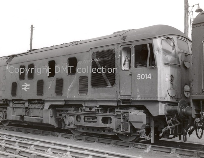 On March 22nd 5014 was noted at Derby Locomotive Works for accident repairs estimated to cost GBP850.00. The damage was to the upper half of the non-BIS side, with scrape like damge from the 2nd man's cab side, radiator grill and two small grills.